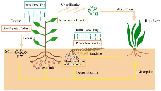 The concept of “allelopathy” was first proposed by Austrian scientist Hans Molisch in 1937 and mainly referred to the chemical relationship of plant interaction. Allelopathy is an ecological phenomenon and plays an important role in the ecological adaptation of plants [1,2]. The allelopathic effects have both positive and negative effects. Various studies have reported the advantages of allelopathic effects in agricultural systems, such as weed control [3,4,5,6], inhibition of pests [7,8,9,10], disease [11,12], improvement of soil nutrition [13,14], and microbial interactions [15,16]. Ultimately, allelopathy of most plants has effect on plant growth [10,17,18]. Plants can synthesize various secondary metabolites during growth and development. Plant VOCs vary by species, and they are related to the abundance of neighboring plant species and plant species composition [19,20]. These secondary metabolites can be beneficial or harmful to other organisms when stored or released into the environment, such as secondary metabolites stored in plants that can prevent animal feeding and microbial infestation, while volatiles released into the air can attract insect pollinators [21]. Plants communicate with organisms in the environment through VOCs, thereby achieving a wide range of ecological functions, such as affecting their growth, development, defense, reproduction, and life cycle [22]. In 1984, allelopathy was defined as “any direct or indirect harmful effect by one plant (including microorganisms) on another through production of chemical compounds released into the environment” by Rice [23]. These products of secondary metabolism, called allelochemicals, can be found in any organ of the plant (leaves, stems, flowers, seeds, fruits, and/or roots) and can be released from the producing plant by different routes: volatilization, foliar leaching, root exudations, and decomposition of plant residue (Figure 1).