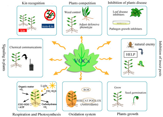 With the increasing attention of experts on the allelopathy of volatile, the potential role of VOCs in agriculture has been gradually discovered. The allelopathy of VOCs on plants are summarized based on existing research, which involved the main allelopathy of plant VOCs. (Figure 2).