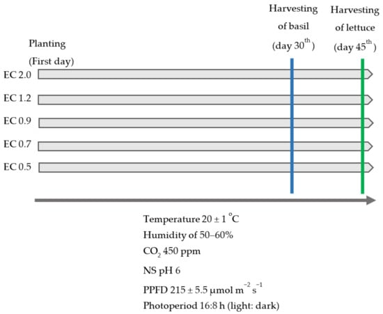 To study the effect of EC on the growth parameters, we designed an experiment in a randomized complete block design with five treatments (Figure 1). Each treatment was replicated four times. The experiments were conducted in an environment with a day temperature of 20 ± 1 °C, night temperature of 16 ± 2 °C, a relative humidity of 50–60%, and a CO2 concentration of 450 ppm. The pH of the nutrient solution was set on 6 and was kept fixed during the experiment by using a pH-adjustment dosing machine. The PPFD (photosynthetic photon flux density) of the artificial lighting used on the plants was 215 ± 5.5 μmol m−2 s−1, and the photoperiod was 16:8 h of light/dark. During the study, all conditions were monitored continuously and kept fixed based on the protocol used for growing the plants. The protocol defined growing processes, control, and adjustments of the environment and sampling processes. The only parameter that was variable in different treatments was EC. We used five different EC treatments levels of 2.0, 1.2, 0.9, 0.7, and 0.5 dS m−1 and kept them as a constant value during the experiment using an automatic dosing machine with an accuracy of 2% (see Table A1 in Appendix A).