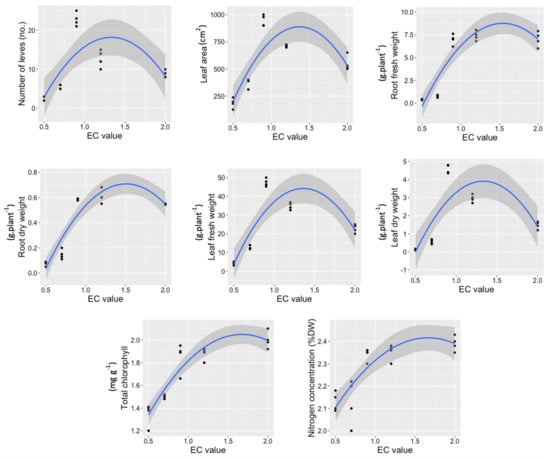 Relationship between EC value and basil growth parameters. The gray area is a zone that covers the 95% confidence level.