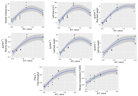 In this study, we estimated the relationship between lettuce and basil growth parameters and EC levels using regression analysis. It is the most common machine learning program that indicates different types of relationships between different parameters based on observed data [25]. To select the best fit model, an adjusted R square was used (with significance at a p-value of 0.05). The most fit model for determining the relationship between dry and fresh weight of root and chlorophyll in relation to the EC levels and leaf area and weight of fresh leaf in relation to the EC levels for both plants are power and quadratic models, respectively. However, the estimated models for other variables are not similar between two plants. The linear model was not a fit model for any growth parameters of lettuce and basil. The cubic model was only fit for the nitrogen concentration of basil and the number of leaves of lettuce in relation to EC levels.