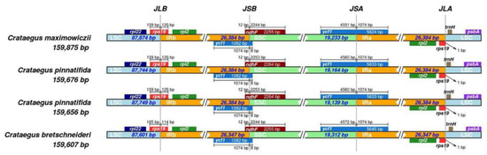 Comparison of the LSC, IR, and SSC borders among the four Crataegus plastomes.