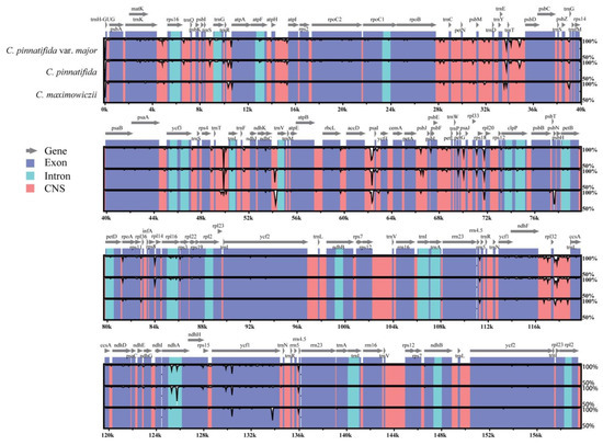 Sequence alignment of the four Crataegus chloroplast genomes in the mVISTA program. C. bretschneideri was employed as a reference. The x-axis indicates coordinates in the chloroplast genome. The vertical axis represents sequence alignment similarity of 50–100%. Gray arrow indicates gene orientation. Purple indicates exons, blue indicates introns, and pink indicates conserved non-coding sequences (CNSs).