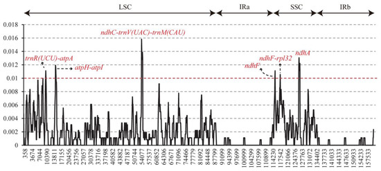 Gene mutation and rearrangement in the chloroplast genome are not always present randomly throughout the genome sequence, often being focused in certain ‘hotspot’ regions instead [73]. Comparative analysis of chloroplast genome sequences isa feasible means for identifying hypervariable regions; these mutation hotspots canserve as specific molecular markers. In present study, six hypervariable regions—ndhC-trnV(UAC)-trnM(CAU), ndhA, atpH-atpI, ndhF, trnR(UCU)-atpA, and ndhF-rpl32—were identified.