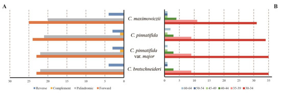 Next, repeat sequences were examined in the four Crataegus plastomes (Figure 6; Table S1). A total of 196 repeat sequences, containing forward, reverse, complement, and palindromic repeats, were observed among the four Crataegus plastomes. Among all the detected repeats, forward (48.5%) and palindromic repeats (43.4%) are relatively common, whereas reverse (7.1%) and complement repeats (1%) are comparatively rare (Figure 6; Table S1). One pair of complement repeats is only present in C. pinnatifida var. major and C. pinnatifida. The sizes of the repeats among the four plastomes vary from 30 to 63 bp. The majority of repeats (68.9%) are limited to 30–34 bp in size (Figure 6; Table S1).
