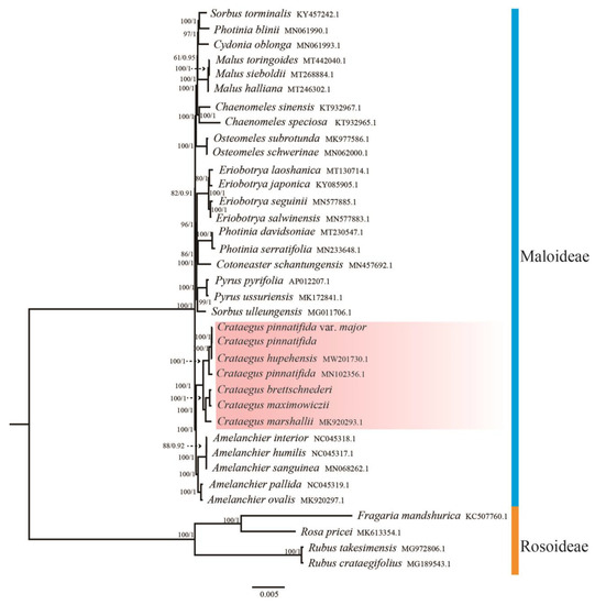 The Bayesian inference (BI) and maximum likelihood (ML) methods wereemployed to plot phylogenetic trees with the complete chloroplast genomes. The entire chloroplast genomes sequences of seven species of Crataegus and another 25 plastomes of species of Maloideae were used in the phylogenetic analyses, with four plastomes of the sister group Rosoideae as an outgroup. The best-fitting substitution model GTR+F+I+G4 was employed using Modelfinder [43] on the basis of Bayesian information criterion. IQ-TREE software was used to perform ML calculations [44]. Bootstrap analysis was conducted with 1000 replicates. BI analysis was conducted by MrBayes software. Bayesian analysis was run for 10,000,000 generations with sampling trees every 1000 generations and the first 25% were removed as burn-in. The average standard deviation of the split frequencies was >0.01.
