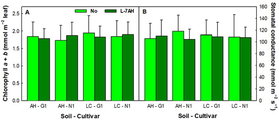 Chlorophyll content (A) and stomatal conductance (B) of L. albus G1 and N1 plants inoculated with B. canariense L-7AH on non-inoculated grown in soils from Almadenejos (AH) or Las Cuevas (LC). Total chlorophyll content and stomatal conductance were determined for the two youngest fully expanded leaves of 6-week-old plants grown in a shade. Data are means ± SD, n = 24.