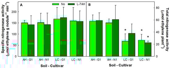 We have previously shown that both soils, AH and LC, contained native rhizobia able to nodulate L. albus G1 and N1 plants, and that plants inoculated with B. canariense L-7AH or non-inoculated presented significant differences in nodulation depending on the soil origin. Namely, plants grown in AH soil had 40–50 nodules (0.38–0.55 g), while those grown in LC soil had around 20 nodules (0.15–0.25 g) per plant [57]. In the present work, no significant differences in specific nitrogenase activity (activity per gram of nodule) existed between nodules of L. albus cv. G1 or N1 plants inoculated with B. canariense L-7AH or non-inoculated and grown in AH or LC soils (Table S1, Figure 2A). The specific nitrogenase activity values obtained here were in the same range of those observed for L. albus plants inoculated with B. canariense L-7AH and grown in hydroponic conditions in the absence of Hg [35]. Nodule weight of plants grown in AH soil practically doubled that of plants grown in the LC soil [57]. Soil had an effect on the nitrogenase activity per plant (Table S1), which was approximately twice as high in plants grown in AH soil (Figure 2B).
