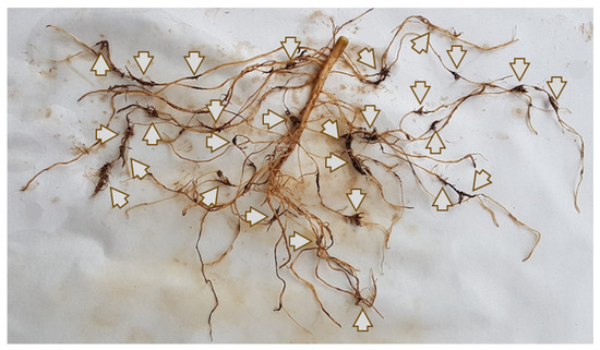 Root of a 6-week-old L. albus G1 plant inoculated with B. canariense L-7AH and grown in soil from Almadenejos. Arrows indicate cluster roots.
