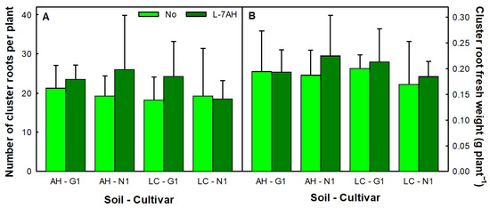 Number (A) and weight (B) of cluster roots per plant. L. albus G1 and N1 plants were inoculated with B. canariense L-7AH or non-inoculated and grown in Almadenejos (AH) or Las Cuevas (LC) soils. Means (n = 12) ± SD are shown.