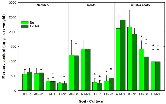 Nodules from plants grown in AH soil accumulated around 600 μg Hg g−1 dry weight (DW) while plants grown in LC soil accumulated around 250–300 μg Hg g−1 DW, independently of cultivar or inoculation. Differences between soils were only statistically significant for nodules of plants inoculated with B. canariense L-7AH. Hg accumulation in roots was significantly higher in plants grown in AH soil (1200–1400 μg Hg g−1 DW) than in plants grown in LC soil (250–450 μg Hg g−1 DW), for both cultivars and inoculation treatments. Cluster roots accumulated the largest amounts of Hg. Cluster roots of plants grown in AH soil accumulated 1850–2550 μg Hg g−1 DW, while cluster roots from plants grown in LC soil showed values between 800 and 1400 μg Hg g−1 DW. The differences between soils were statistically significant for both cultivars (Figure 5).