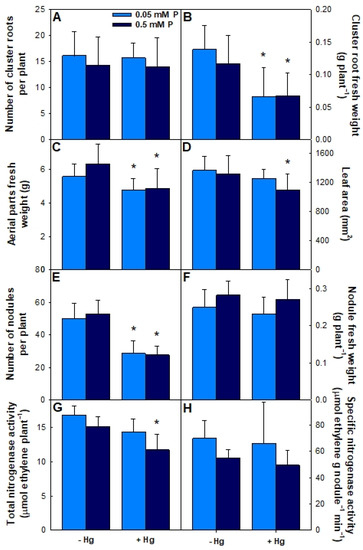 Effect of Hg on cluster roots number and weight (A,B); growth parameters (C,D); nodulation (E,F) and nitrogen fixation (G,H) in plants grown hydroponically under two P concentrations. L. albus cv. G1 plants were inoculated with B. canariense L-7AH. Plants were grown in vermiculite and deprived of P for three weeks; then, two different P concentrations (0.05 or 0.5 mM) were added to the nutrient solution. One half of the plants were watered with nutrient solution containing 50 μM HgCl2. Means (n = 10) ± SD are shown. Asterisks (*) indicate significant differences between plants exposed to Hg or not.
