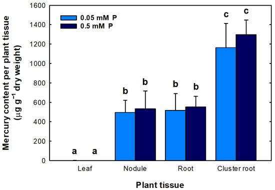 Mercury accumulation in leaves, nodules, roots and cluster roots of L. albus G1 plants inoculated with B. canariense L-7AH and grown hydroponically, in the presence of 50 μM HgCl2. Plants were deprived of P for three weeks, and thereafter, two P concentrations (0.05 and 0.5 mM) were added to the nutrient solution. Means (n = 4) ± SD are shown. Different letters indicate significant differences.