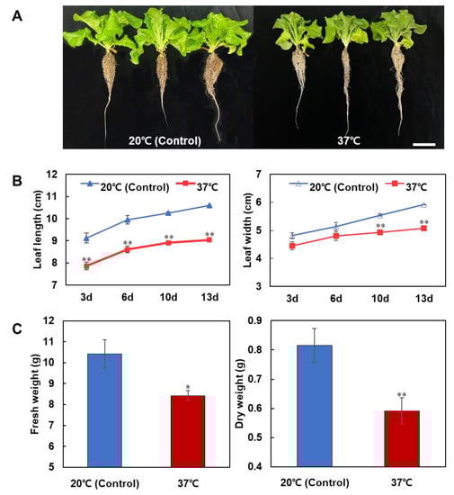 Effect of heat stress on the early vegetative development of lettuce. (A) Lettuce plants treated with heat stress (37 °C) and with optimal temperature (20 °C) during 24 h. Scale bar = 5 cm. (B) Changes in leaf length and width in lettuce at 3, 6, 10 and 13 days after heat treatment compared to control. (C) Changes in fresh weight and dry weight in lettuce with and without heat treatment. Asterisks indicate significant differences compared with the control (* p < 0.05, ** p < 0.01, Student’s t test). Each bar represents mean ± SE of three independent experiments.