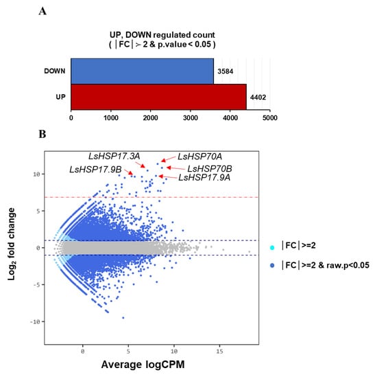 Transcriptome profiling of gene expression dynamics in lettuce with heat treatment. (A) Number of differentially expressed genes (DEGs) in lettuce with heat treatment (37 °C) compared to those with optimal temperature (20 °C) for 1 h. (B) The EdgeR smear plot shows the Log2 fold change (FC, y-axis) against the average log count per million (CPM, x-axis). The dashed red line shows the location of the value of FC = 100. Points above the line have FC > 100 and those below the line have FC < 100 values. The red arrows indicate the top five LsHSP genes displaying both a large magnitude of FC and high expression volume. The two dashed blue lines represent two-fold changes. This plot is colored such that those points having a fold-change less than |FC|< 2 are shown in gray, |FC|≥ 2 in pale blue, and |FC|≥ 2, raw. p-value < 0.05 in dark blue.