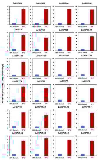 The smear plot in Figure 2B represents the distribution of DEGs in the up- or downregulated section and confirms the genes are differentially expressed compared to the control according to expression volume, which is defined as the geometric mean of two groups’ expression level. Twenty-four LsHSP genes upregulated more than a 100-fold under the 1 h heat treatment were selected for further studies (Table 2). Among them, the five HSP genes with the highest differential expression were LsHSP70A, LsHSP70B, LsHSP17.3A, LsHSP17.9A and LsHSP17.9B.