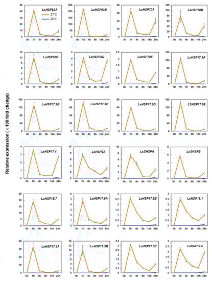 To investigate changes in the gene expression under heat stress, the expression levels of the 24 LsHSP genes in plants exposed to heat stress for 0 h, 1 h, 4 h, 8 h, 14 h and 24 h were determined by qRT-PCR. The highest expression level of the 24 LsHSP genes was observed at the 1 h time point after heat treatment, suggesting that all the LsHSP genes selected are likely to respond early to heat stress (Figure 4). Almost all the LsHSP genes examined had a distinct peak expression in response to heat at the 1 h time point, which drastically declined at the 4 h time point, with the exceptions of LsSHSPA, LsHSP17.5 and LsHSP18.1, which exhibited more than 50% of their peak expression at the 4 h time point.