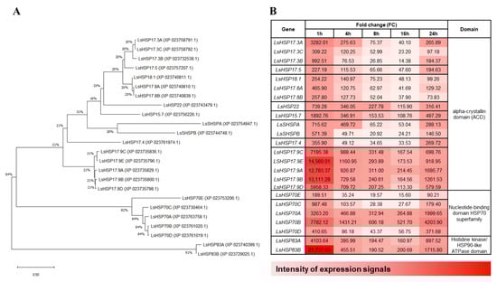 Phylogenetic tree based on protein sequences of heat shock proteins (HSP). Phylogenetic analysis of the LsHSPs whose mRNA expression is upregulated under heat stress in lettuce. (A) The neighbor-joining phylogenetic tree was constructed using MEGA X and tested by 1000 bootstraps. Those proteins can be grouped by their main domain: (1) the upper cluster contained the alpha-crystallin domain, (2) the middle cluster contained the nucleotide-binding domain (NBD) of the HSP70 superfamily, and (3) the last cluster contained the α-crystallin domain (ACD). (B) The expression level pattern of LsHSP genes under heat stress are visualized in a heat map. The darker red represents the high intensity of expression signals.