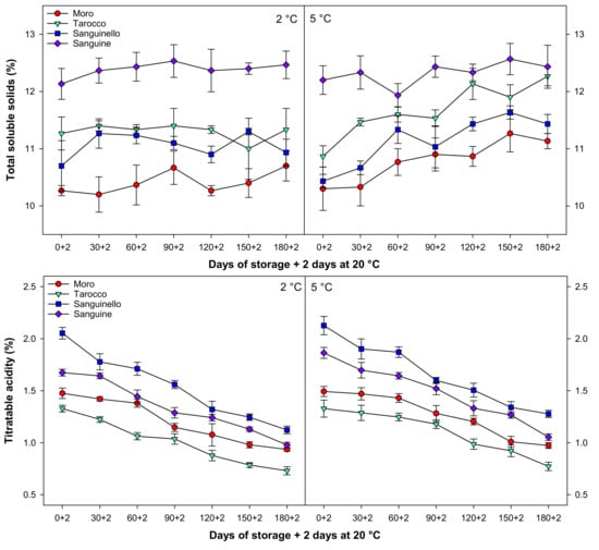 Total soluble solids (TSS) slightly increased during cold storage at both temperatures (Figure 3). ‘Sanguine’ had higher TSS at all sampling times at both temperatures, the highest TSS being found at 5 °C after 150 days of storage. The lowest TSS was observed in ‘Moro’ cultivar at both temperatures among cultivars.