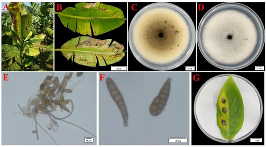 - Lin, S.H.; Liang, S.; Huang, Q.Q. Characterization of Exserohilum rostratum, a new causal agent of banana leaf spot disease in China. Australas. Plant Pathol. 2011, 40, 246–259. [Google Scholar] [CrossRef]