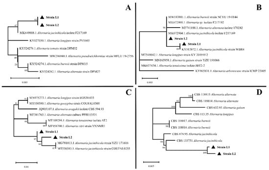 Phylogenetic trees constructed using GAPDH, TEF, Alt a1, and tandemly linked ITS, GAPDH, TEF, and Alt a1 sequences from Alternaria species. (A) Phylogenetic tree constructed using GAPDH gene sequences from different Alternaria species. (B) Phylogenetic tree constructed using TEF gene sequences from different Alternaria species. (C) Phylogenetic tree constructed using Alt a1 gene sequences from different Alternaria species. (D) Phylogenetic tree constructed using tandemly linked ITS, GAPDH, TEF, and Alt a1 sequences from different Alternaria species. The numbers at the nodes indicate the bootstrap values calculated for 1000 repetitions. The isolated strain L1 and strain L2 is shown in bold and triangle.