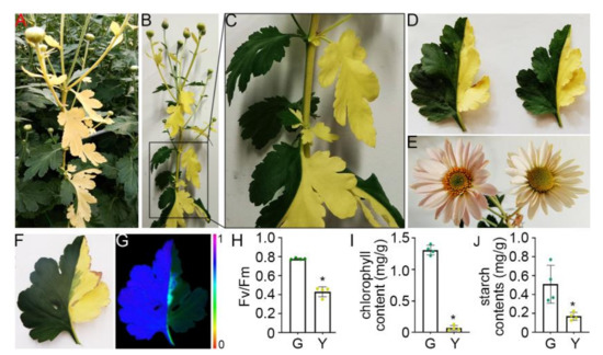 The cultivation of chrysanthemum for commercial purposes has produced many cultivars of bud sport mutants [23]. Recently, we identified a bud sport mutant of the variety ‘Nannong Binyun’ that had yellow branches (Figure 1A). The main stem of this mutant exhibited an asymmetrical half-green and half-yellow appearance, with the regular green branches from the green zone, yellow branches from the yellow zone, as well as half-green and half-yellow branches from the green-yellow transition zone (Figure 1B,C). Under normal conditions, yellow leaves senesced significantly faster and had smaller average leaf size compared to that of green leaves (Figure 1D). Both the green and yellow branches could produce flower, with lighter flower color in the yellow branches (Figure 1E). Although the Fv/Fm parameter could not be used to determine the quantum efficiency of PSII photochemistry [24], it usually correlates with the yield of PSII [25]. To examine the efficiency of photosynthesis, we compared the Fv/Fm ratio of green and yellow parts in the same leaf. The Fv/Fm ratio of the yellow part was markedly lower than that in the green part (Figure 1F–H, Supplementary Table S3). The yellow branches can grow in the Murashige and Skoog (MS) medium, and produce new yellow branches; however, it could not independently grow in the soil, probably due to the lack of chlorophyll that impairs the efficiency of photosynthesis (Figure 1F–I). The analysis of starch content revealed a distinct decrease in the accumulation of photosynthetic products in yellow leaves (Figure 1J). Collectively, our data indicated that the chrysanthemum mutant sectors have a deficiency in chlorophyll synthesis or maintenance, resulting in the decline in photosynthetic efficiency and the lack of energy supply that collectively attenuates its growth.