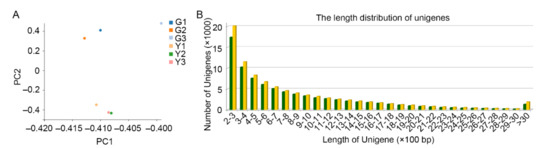 Summary of paired-end sequencing using DNBSEQ platform (MGI). (A) Principal component analysis (PCA) plot for the expression of unigenes in different samples; (B) the length distribution of unigenes identified in the transcriptomes of green and yellow tissues.