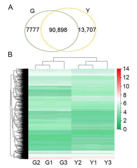 Unigene expression in green and yellow tissues. (A) Venn diagrams showing genes expressed in green and yellow tissues. G: the shared genes among the three biological replicates for green tissues; Y: the shared genes among the three biological replicates for yellow tissues; (B) heat map showing the expression pattern of genes in green and yellow tissues. Expression level of genes was computed as log10-transformed values of fragments per kilobase per million reads (RPKM).