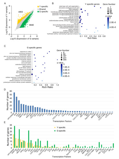 Unigenes that are differentially expressed between green and yellow leaf tissues. (A) Scatter plot showing the expression pattern of genes in green and yellow tissues. Yellow color indicates the upregulated unigenes in yellow tissues, green color indicates the upregulated unigenes in green tissues, gray color indicates genes that are expressed in both green and yellow tissues. The tissue-enriched unigenes were identified by q ≤ 0.05, with |Log2(RPKM_Y/RPKM_G)| ≥ 1; (B–C) gene ontology (GO) analysis of differentially expressed unigenes in yellow tissues (B) or green tissues (C). G indicates green leaf tissue; Y indicates yellow leaf tissue; (D–E) number of tissue-enriched unigenes from different transcription factor family; (D) all unigenes that are differentially expressed in both green and yellow tissues were analyzed; (E) the unigenes that are differentially expressed in green and yellow tissues were analyzed.