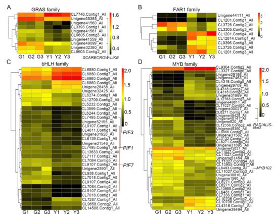 Summary of unigenes that may contribute to chlorophyll deficiency. Heat map showing the expression pattern of unigenes from the GRAS (A), FAR1 (B), bHLH (C), and MYB (D) families in green and yellow tissues. G1–G3: three biological replicates for green tissues; Y1–Y3: three biological replicates for yellow tissues.