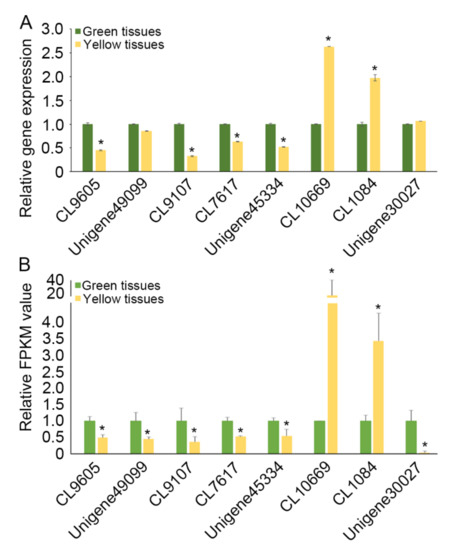 Validation of unigenes that respond to chlorophyll deficiency. (A) Relative unigene expression values detected by qPCR. Relative transcript levels were normalized with CmEF1α as the standard. The green and yellow tissues from three leaves in a single plant were bulked for qRT-PCR test. Error bars indicate the standard error of the mean of three technical replicates. (B) Relative unigene expression values detected by RNA-seq. Error bars indicate the standard error of the mean of three biological replicates. * p < 0.05 when compared to the control by one-tailed unpaired t-test. Error bars represent SD.
