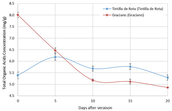 In general, both accessions showed a slightly different behavior. The total organic acid content on the first day of sampling was very different between the two accessions. While ‘Graciano’ showed a total content of 8.009 ± 0.070 mg/g, ‘Tintilla de Rota’ showed a content of 5.392 ± 0.338 mg/g, which was the significantly smaller difference observed (ANOVA p < 0.05). Occasionally, the values obtained for ‘Tintilla de Rota’ seem to indicate that the same level of ripening had not yet been reached between the two accessions. However, already in the second sampling point, it was observed that the behavior between both accessions was very similar. Thereafter, in both cases a slight oscillation in total acid content was observed, ‘Graciano’ being the accession with the lowest values compared to ‘Tintilla de Rota’.