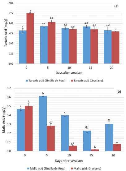 Variation of tartaric acid (a) and malic acid (b) concentration in ‘Tintilla de Rota’ and ‘Graciano’ accessions after veráison (n = 3) in dry weight. Different letters mean there are significant differences between samples (p < 0.05, two-way ANOVA, BSD test).