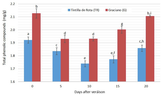 Evolution of total phenolic compounds (excluding anthocyanins) in ‘Tintilla de Rota’ and ‘Graciano’ accessions (n = 3) in dry weight. Different letters mean there are significant differences between samples (p < 0.05, two-way ANOVA, BSD test).