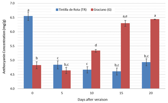 Evolution of total anthocyanin concentration quantified in ‘Tintilla de Rota’ and ‘Graciano’ accessions (n = 3) in dry weight. Different letters mean there are significant differences between samples (p < 0.05, two-way ANOVA, BSD test).