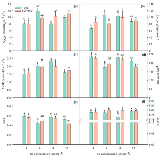 Effects of different selenium concentrations (0, 4, 8, and 16 µmoles L−1) and two types of irrigation water (100S or 50F/50D) on: (a) net CO2 assimilation rate (ACO2); (b) stomatal conductance (gs); (c) transpiration rate (EVAP); (d) internal CO2 concentration (Ci); (e) the internal CO2 concentration/ambient CO2 ratio (Ci/Ca); and (f) maximum potential quantum efficiency of photosystem II (Fv/Fm) in lettuce. The data are presented as the treatment means (n = 6). Different lower-case letters indicate significant (p ≤ 0.05) differences between different dosages of selenium combined with the 100S treatment, and different capital letters indicate significant (p ≤ 0.05) differences between different dosages of selenium combined with the 50F/50D treatment. * denotes significant differences (p ≤ 0.05) between plants submitted to 100S treatment and those irrigated with 50F/50D for the same Se treatment.