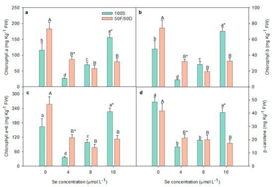 Effects of different selenium concentration (0, 4, 8, and 16 µmoles L−1) and two types of irrigation water (100S or 50F/50D) on: (a) chlorophyll a; (b) chlorophyll b; (c) chlorophyll a + b; and (d) β-carotene in lettuce. The data are presented as the treatment means (n = 6). Different lower-case letters indicate significant (p ≤ 0.05) differences between different dosages of selenium combined with the 100S treatment and different capital letters indicate significant (p ≤ 0.05) differences between different dosages of selenium combined with the 50F/50D treatment. * denotes significant differences (p ≤ 0.05) between plants submitted to 100S treatment and those irrigated with 50F/50D for the same Se treatment.