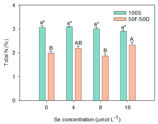 Effects of different selenium concentrations (0, 4, 8, and 16 µmoles L−1) and two types of irrigation water (100S or 50F/50D) on total nitrogen in lettuce. The data are presented as the treatment means (n = 6). Different lower-case letters indicate significant (p ≤ 0.05) differences between different dosages of selenium combined with the 100S treatment and different capital letters indicate significant (p ≤ 0.05) differences between different dosages of selenium combined with the 50F/50D treatment. * denotes significant differences (p ≤ 0.05) between plants submitted to 100S treatment and those irrigated with 50F/50D for the same Se treatment.