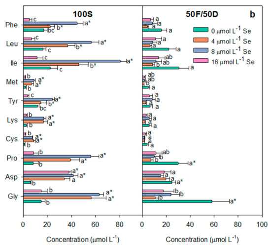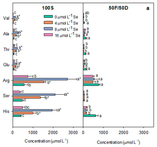 Nevertheless, when Se was applied in combination with the 50F/50D treatment, no such increase was observed, quite the contrary. Plants irrigated with the 50F/50D and Se treatment (mainly at 4 and 8 µmol L−1) reduced their content in some of the measured amino acids (His, Glu, Thr, Val, Gly, Pro, Met, and Ile) (Figure 5a,b). However, with the higher concentration of Se, this reduction was only significant in three amino acids (His, Thr, and Gly).