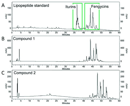 - Kim, P.I.; Ryu, J.; Kim, Y.H.; Chi, Y.T. Production of biosurfactant lipopeptides iturin A, fengycin, and surfactin A from Bacillus subtilis CMB32 for control of Colletotrichum gloeosprioides. J. Mirobio. Biotechnol. 2010, 20, 138–145. [Google Scholar] [CrossRef]