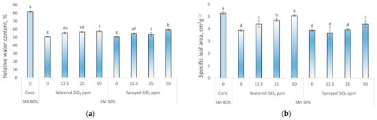 In plants, decreased growth parameters may be due to decreased relative water content (RWC) and corresponding cell contraction, decreased meristematic cell division, decreased leaf growth, accelerated aging, blocked leaf production, and leaf fall. Water stress can also directly affect the biochemical processes involved in photosynthesis and indirectly reduce the uptake of carbon dioxide into the stoma, which closes during drought. In this study, relative water content (RWC) (Figure 1a) and specific leaf area (SLA) (Figure 1b) of pea plants significantly decreased during drought stress, but watering or spraying with a suspension containing SiO2 NPs increased their contents. Plant membranes are the first place in the cell which are influenced under stress conditions and the ability of plants to protect the integrity of membranes under drought stress determines the tolerance of the plants to drought stress []. Under drought stress, the water potential of soil decreases, and plants prevent transpiration phenomenon using different mechanisms such as closing stomata, increasing stomatal resistance, and decreasing stomatal conductivity. Scientists showed that the improving effect of Si on the hydration status of plants may help to reduce leaf and stem transpiration or the deposition of phytolith under epidermal cells, resulting in a decreased waste of water from cuticle layers []. According to that concentration of 50 ppm, SiO2 NPs play an important role in increasing RWC in pea plants (Figure 1a) under stressful conditions. Similar RWC results were found in drought-affected strawberries [], wheat [], and cucumber []. The researchers also found a statistically positive increase in rice height, shoot, and root weight under Cd stress and spraying of SiO2 NPs []. A study by other scientists has shown that drought stress has negatively affected wheat growth rates and yields [], but the use of SiO2 NPs, especially through soil application at 30 and 60 ppm, reduced the negative effects of drought stress by reducing transpiration, improving the rate of photosynthesis, increasing chlorophyll content and RWC. Moreover, similar results were found in peas [], maize [], and wheat [] affected by various stressors, with a statistically positive increase in fresh leaf and root biomass, also leaf area using Si NPs.