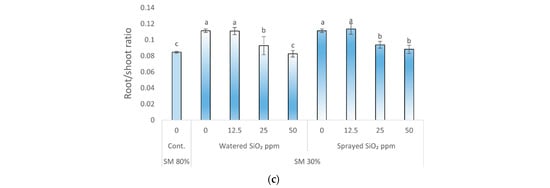 There was a statistically significant increase in the root/shoot ratio (Figure 1c) when comparing drought-affected (0 ppm SiO2 NPs, SM 30%) and control plants (SM 80%). Comparing the effects of 0 ppm and 12.5 ppm SiO2 on plant root/shoot ratio when watered or sprayed in drought treatment, no statistically significant difference was found. However, a statistically significant effect on root/shoot ratio was found by watering or spraying peas at a concentration of 25 ppm SiO2 compared to SiO2 NPs untreated plants (0 ppm) in drought-affected peas. Meanwhile, the root/shoot ratio of peas grown under drought did not differ significantly from control plants when were watered or sprayed with 50 ppm SiO2 NPs.