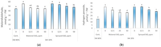 Influence of drought stress and SiO2 NPs (0; 12.5; 25; and 50 ppm) on malondialdehyde content (MDA), (a); hydrogen peroxide (H2O2), (b) in P. sativum L. Cont.—control plants, substrate moisture (SM) 80%; drought stress—SM 30%. Values are mean ± SE of three replicates and different letters are differed significantly by Tukey HSD Test (p < 0.001).