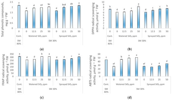 Influence of drought stress and SiO2 NPs (0; 12.5; 25; and 50 ppm) on total phenolic compounds (a); DPPH radical scavenging activity (b); FRAP radical scavenging activity (c); ABTS radical scavenging activity (d) in P. sativum L. Cont.—control plants, substrate moisture (SM) 80%; drought stress—SM 30%. Values are mean ± SE of three replicates and different letters are differed significantly by Tukey HSD Test (p < 0.001).