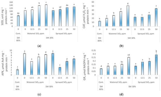 Response of (a), superoxide dismutase (SOD); (b), catalase (CAT); (c), ascorbate peroxidase (APX); (d), glutathione reductase (GR) activity to drought stress and SiO2 NPs (0; 12.5; 25; and 50 ppm) in P. sativum L. Cont.—control plants, substrate moisture (SM) 80%; drought stress—SM 30%. Values are mean ± SE of three replicates and different letters are differed significantly by Tukey HSD Test (p < 0.001).