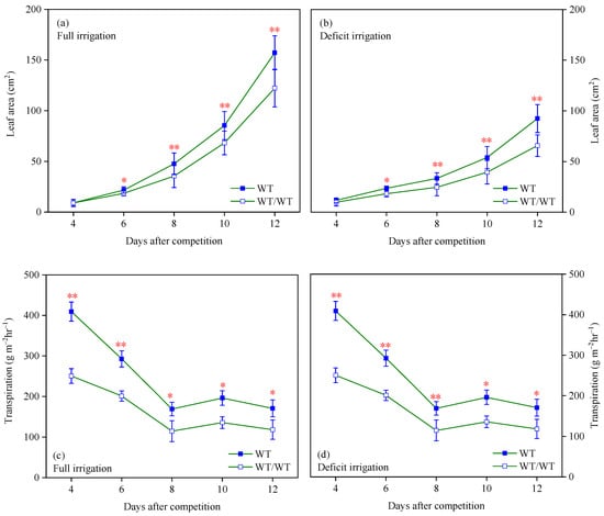 Variations of leaf area and transpiration in CK and the treatment of competition under full irrigation (a,c) and deficit irrigation (b,d). * Indicates significant difference between treatments (* p < 0.05, ** p < 0.01).