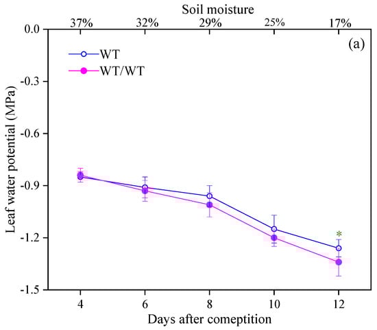 Under full irrigation, the leaf water potential (LWP) of single WT plant (−0.58 ± 0.03 MPa) was similar to that of the competing plants (−0.60 ± 0.03 MPa). Furthermore, there was no significant difference in LWP between the single plant and competing plants under deficit irrigation (Figure 2a). The abaisial stomatal conductance (gs) of fully expanding leaves are shown in Figure 2b,c. Under the well-watered condition, the intraspecific competition significantly reduced the gs of WT tomato. As soil moisture depleted gradually, the difference in gs between the single tomato and the competing plants was markedly decreased from 26% at 4 days after competition to 16% at 10 days after competition. Although the LWP was similar between the single plant and competing plants, the difference in gs between the two treatments was measured in our experiment. The result indicated that the non-hydraulic signals contributed for regulating the stomatal opening of competing plants. However, under severe drought (at 12 days after competition), the gs of single tomato was not significantly higher than that of competing plants, as the LWP in competing plants was lower than that in the single plant.