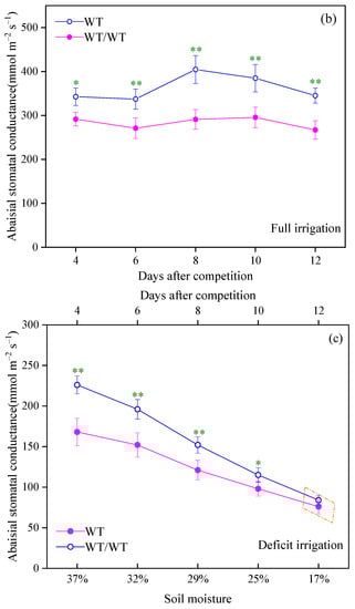 Variation of leaf water potential ((a) deficit irrigation), abaxial stomatal conductance ((b) full irrigation, (c) deficit irrigation) in the single plant and competing plants of wild type tomato (* p < 0.05, ** p < 0.01).