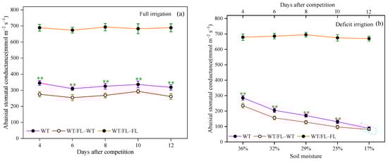 Variation of abaxial stomatal conductance ((a) full irrigation, (b) deficit irrigation) of FL and WT in competing pot. The wild-type tomato and flacca mutant was planted in one pot (WT/FL) (** p < 0.01).