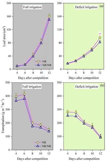 At 4 days after the competition, there was no significant difference in leaf area between the single and competing plants of WT tomato (Figure 1a,b). Subsequently, compared with the single plant, the competing averagely decreased leaf area by 21% under full irrigation and 26% under deficit irrigation. Transpiration was calculated per-unit leaf area basis []. The intraspecific competition significantly decreased transpiration during the sampling period, on average 33% and 28% lower than the single plant under full irrigation and deficit irrigation, respectively (Figure 1c,d).